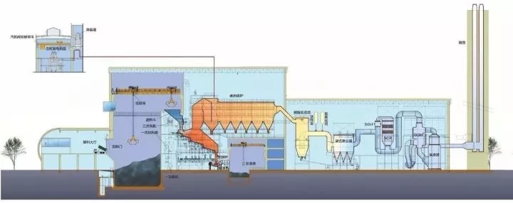 產(chǎn)生的高溫?zé)煔饨?jīng)過余熱鍋爐回收熱量,產(chǎn)生的蒸汽經(jīng)過汽輪機發(fā)電機組發(fā)電。煙氣凈化系統(tǒng)則是整個項目最大的亮點,在國內(nèi)常用的“五步處理法”基礎(chǔ)之上加以改進,三步脫酸、兩步除塵、兩步脫硝,是國內(nèi)唯一一家采用如此復(fù)雜工藝流程的在運行項目。