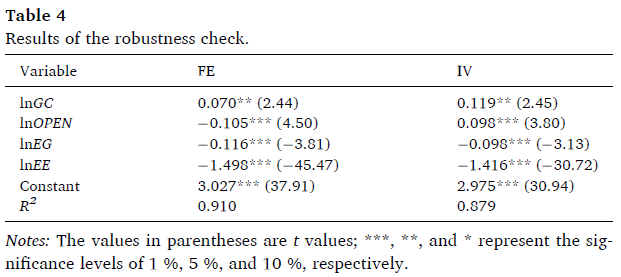 為了緩解模型中存在的由變量缺失或綠色信貸測量誤差引起的內(nèi)生問題,本研究采用綠色信貸的一階滯后項(xiàng)作為工具變量。表3中報(bào)告的工具變量法(IV)產(chǎn)生的估計(jì)結(jié)果與固定效應(yīng)模型基本一致。控制變量的系數(shù)和顯著性水平也與之前的結(jié)果一致。