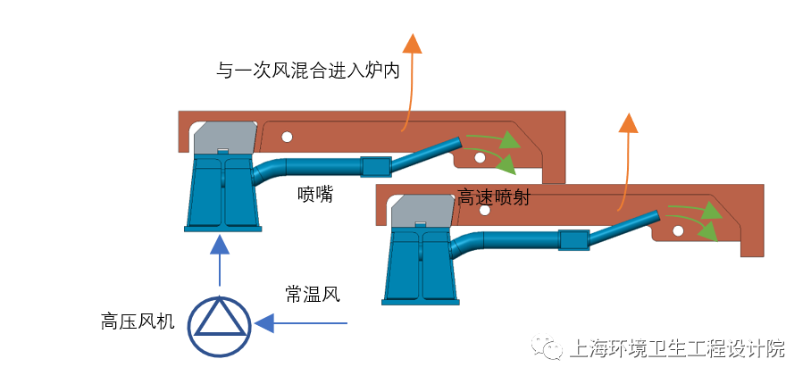 強制風冷依靠風管引入常溫高壓冷卻空氣,通過噴管高速吹掃爐排片高溫區(qū)域,局部溫度平均降低30℃~50℃,從而避免爐排片局部高溫燒損。上海環(huán)境院的風冷爐排系統(tǒng)如圖5所示,常溫空氣經(jīng)過高壓風機吹掃爐排片后與一次風混合進入焚燒爐參與燃燒,該設(shè)計不僅結(jié)構(gòu)簡單,而且便于控制調(diào)節(jié),靈活可靠。
