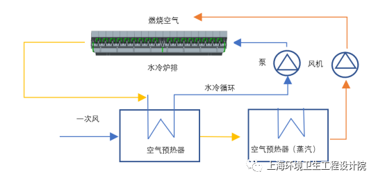 水冷爐排系統(tǒng)熱量可以用于加熱一次風,后經(jīng)過一次風預熱器進入焚燒爐內(nèi)燃燒,實現(xiàn)循環(huán)熱能利用,從而降低熱損失,詳見附圖6。