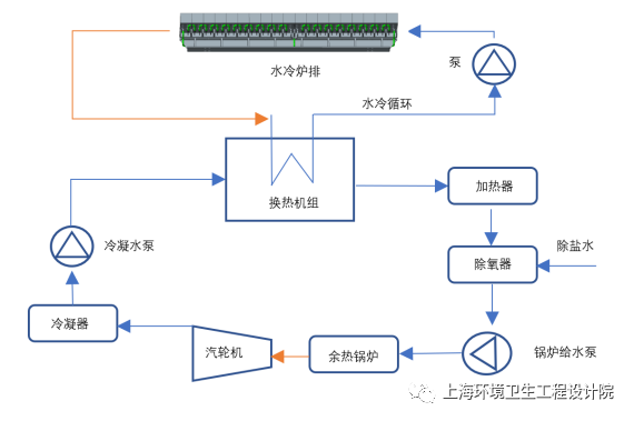 水冷爐排系統(tǒng)熱量也可以進入鍋爐循環(huán)水系統(tǒng)用于驅(qū)動汽輪機組詳見附圖7,從而實現(xiàn)熱量循環(huán)利用??傮w而言,水冷系統(tǒng)能夠帶走熱負荷2-3%,降低系統(tǒng)熱損失,增加焚燒廠發(fā)電量。