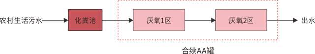 生活污水經(jīng)農(nóng)戶管網(wǎng)收集后首先進入化糞池單元,后流至AA罐分戶污水處理設(shè)備內(nèi),從厭氧1區(qū)到厭氧2區(qū)。