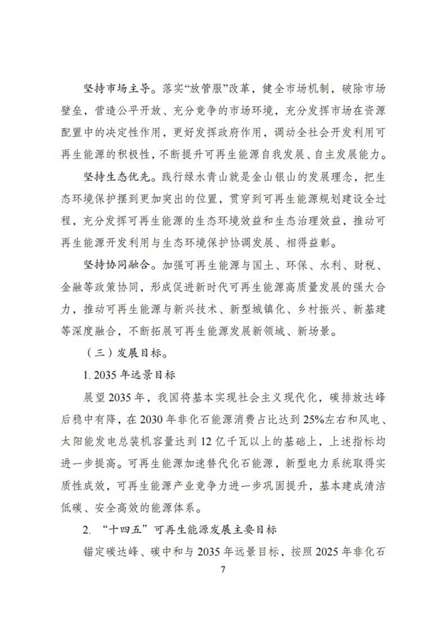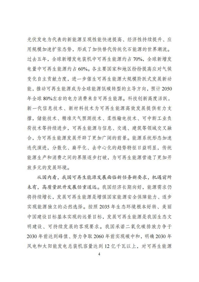 為深入貫徹“四個革命、一個合作”能源安全新戰(zhàn)略,落實碳達峰、碳中和目標,推動可再生能源產(chǎn)業(yè)高質(zhì)量發(fā)展,根據(jù)《中華人民共和國國民經(jīng)濟和社會發(fā)展第十四個五年規(guī)劃和2035年遠景目標綱要》和《“十四五”現(xiàn)代能源體系規(guī)劃》有關(guān)要求,我們組織編制了《“十四五”可再生能源發(fā)展規(guī)劃》?,F(xiàn)印發(fā)給你們,請遵照執(zhí)行。