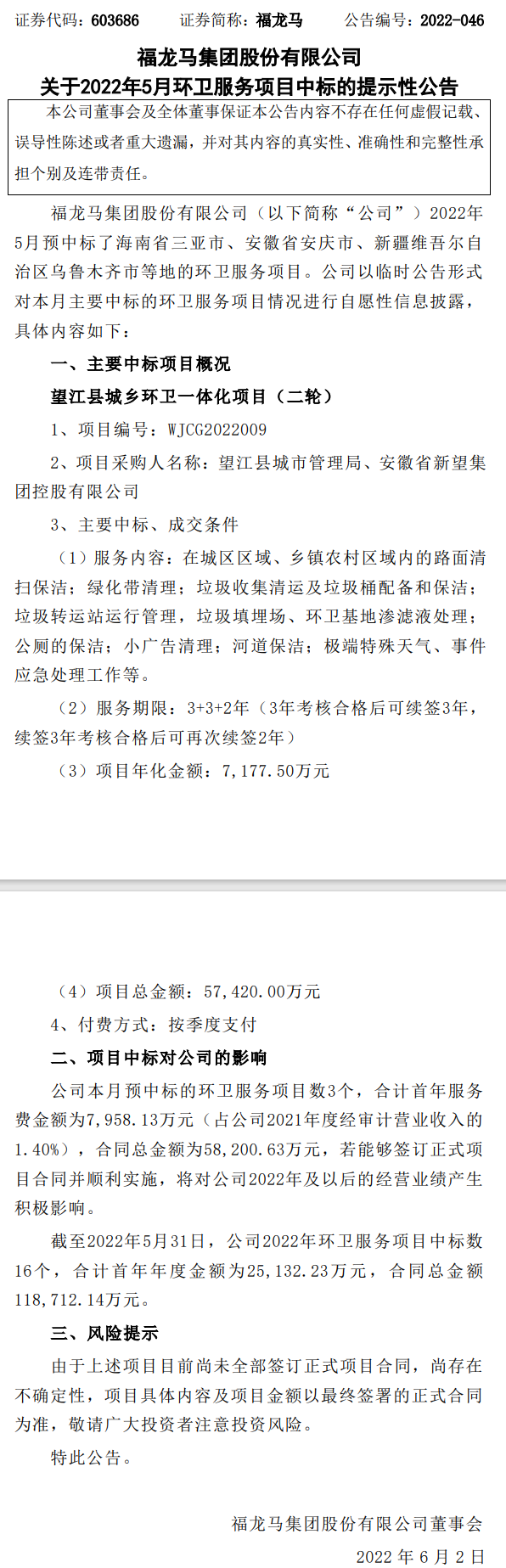 原標題:福龍馬集團股份有限公司關于2022年5月環(huán)衛(wèi)服務項目中標的提示性公告