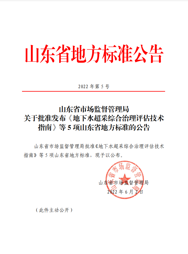 山東省市場監(jiān)督管理局關(guān)于批準(zhǔn)發(fā)布《地下水超采綜合治理評估技術(shù)指南》等5項(xiàng)山東省地方標(biāo)準(zhǔn)的公告