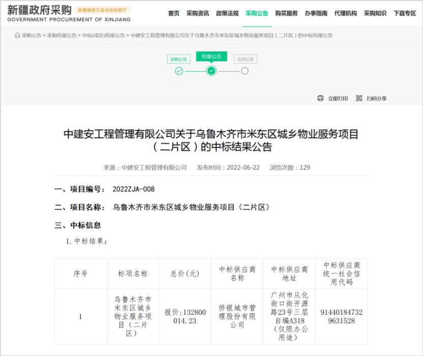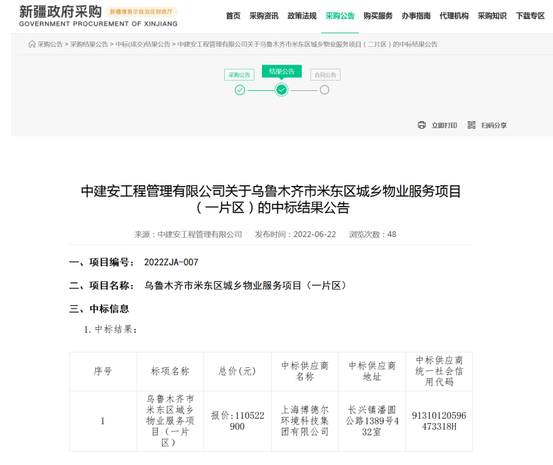 新疆政府采購網(wǎng)消息,2022年6月22日,烏魯木齊市米東區(qū)城鄉(xiāng)物業(yè)服務(wù)項(xiàng)目公布開標(biāo)結(jié)果,兩個(gè)片區(qū)中標(biāo)合同金額超過24億元,成交情況如下: