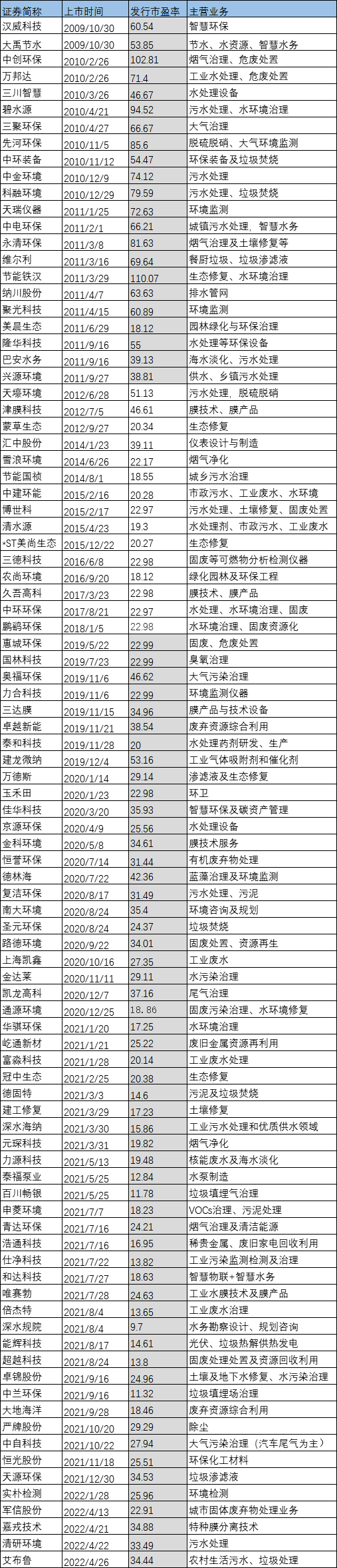 市盈率亦稱(chēng)本益比,是股票價(jià)格除以每股盈利的比率。發(fā)行市盈率是指企業(yè)上市時(shí)股票發(fā)行價(jià)格與股票的每股收益的比例,可以用來(lái)反映資本對(duì)企業(yè)的價(jià)值判斷。一定程度上等同于大家俗稱(chēng)的上市公司的PE值。發(fā)行市盈率高,在一定程度上反映了投資者對(duì)公司當(dāng)前價(jià)值和發(fā)展?jié)摿Φ恼J(rèn)同。這里作者試著從發(fā)行市盈率角度,看看這些年資本對(duì)環(huán)保企業(yè)的態(tài)度變化。