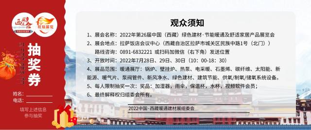 2022年第26屆中國(西藏)綠色建材·節(jié)能暖通及舒適家居產(chǎn)品展覽會(huì)將于2022年7月28日-30日在拉薩飯店會(huì)議中心召開。展會(huì)由西藏建筑裝飾協(xié)會(huì)聯(lián)手北京旺旅展覽展示有限公司傾力打造,西藏建筑業(yè)協(xié)會(huì)大力支持,共享五萬寵大數(shù)據(jù)庫及新媒體資源,專業(yè)邀請經(jīng)銷、代理商、設(shè)計(jì)師與會(huì)洽談;實(shí)現(xiàn)資源共享,品牌聯(lián)盟,吸引眾多品牌積極參與,打造西藏建筑裝飾行業(yè)旗艦展會(huì)。