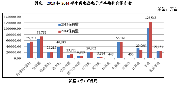 廢棄電器電子產(chǎn)品理論報(bào)廢量的測(cè)算為行業(yè)管理提供重要的依據(jù)。根據(jù)國(guó)家統(tǒng)計(jì)年鑒電器電子產(chǎn)品居民百戶擁有量與居民戶數(shù)測(cè)算的居民保有量見(jiàn)下圖。除固定電話和黑白電視機(jī)之外,其他產(chǎn)品均逐年增長(zhǎng),其中移動(dòng)電話的增長(zhǎng)速度最高。中投顧問(wèn)發(fā)布的《2017-2021年中國(guó)電子廢棄物處理行業(yè)深度調(diào)研及投資前景預(yù)測(cè)報(bào)告》指出,2013和2014年中國(guó)電器電子產(chǎn)品的社會(huì)保有量持續(xù)上升,社會(huì)保有量是根據(jù)電器電子產(chǎn)品銷量與對(duì)于該年報(bào)廢系數(shù)乘積的方法進(jìn)行的測(cè)算。
