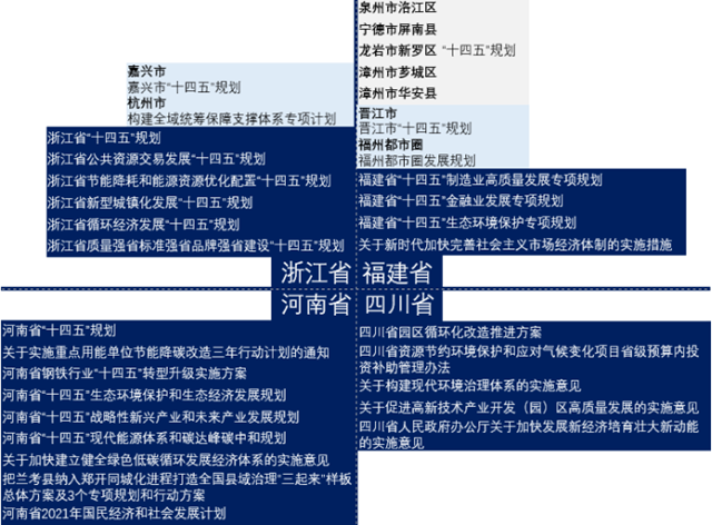 除試點四省外,全國其余省與自治區(qū)均積極響應(yīng)全國“十四五”規(guī)劃對用能權(quán)市場建設(shè)的要求。如下圖所示,我國大陸所有省份均在省級規(guī)劃中將用能權(quán)市場列入,在省級層面對用能權(quán)市場建設(shè)提供支持,多市在市級層面出臺政策與規(guī)劃,進一步提高對用能權(quán)市場建設(shè)的支持力度。有關(guān)政策覆蓋生態(tài)環(huán)境保護、高碳行業(yè)低碳改造、產(chǎn)業(yè)轉(zhuǎn)型升級、金融、環(huán)境權(quán)益交易市場協(xié)調(diào)建設(shè)等多個領(lǐng)域,為我國建設(shè)全國用能權(quán)交易市場以通過市場化手段促進產(chǎn)業(yè)提效轉(zhuǎn)型、推動綠色發(fā)展具有顯著促進作用。