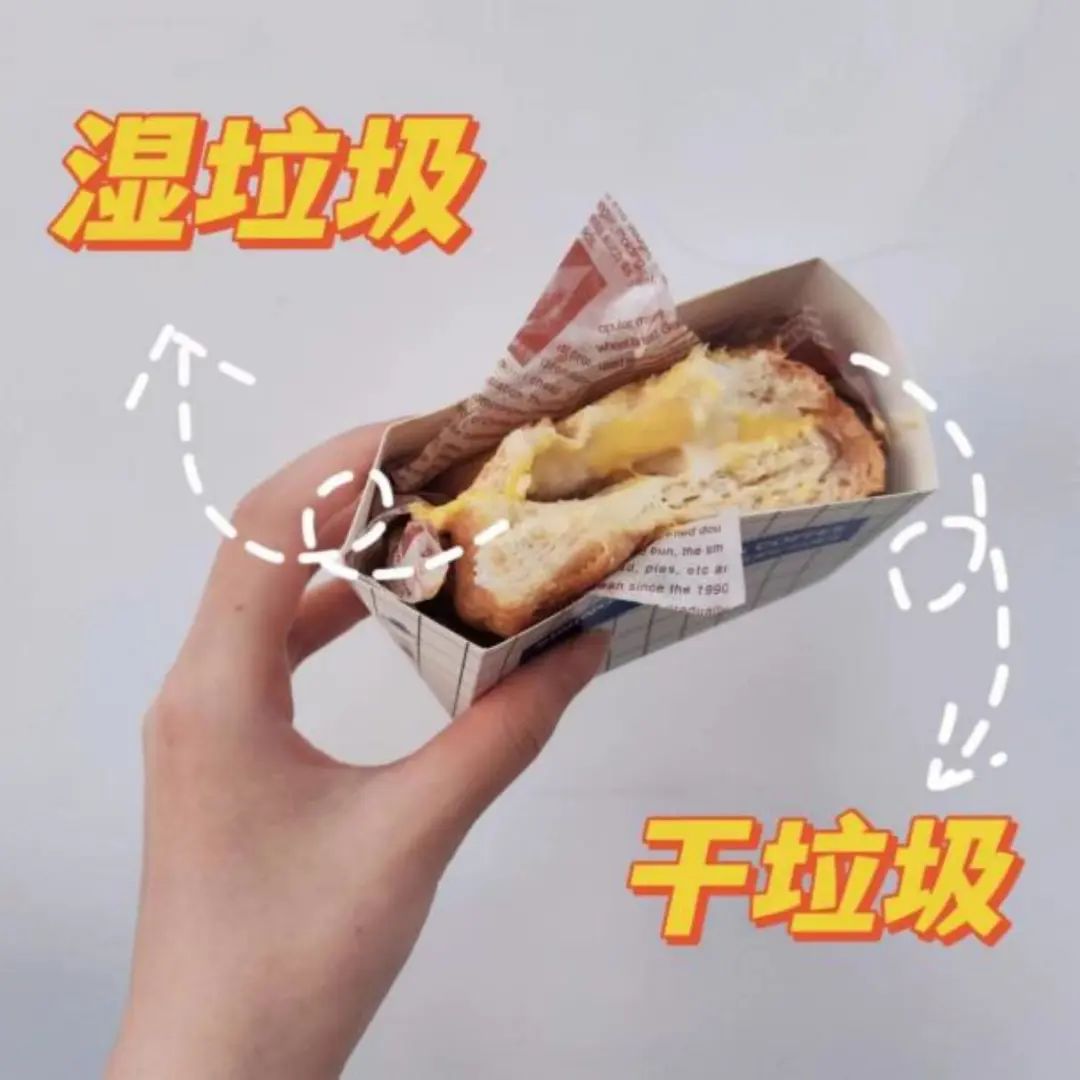 沒吃完的:吃剩的三明治——倒進(jìn)濕垃圾桶;包裝紙——扔進(jìn)干垃圾桶