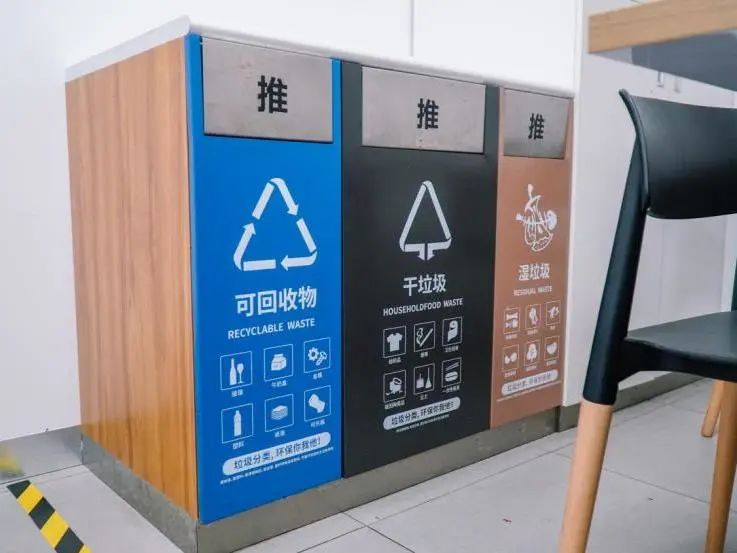 沒吃完的:吃剩的食物——倒進(jìn)濕垃圾桶;飯盒&筷子&勺子——扔進(jìn)干垃圾桶