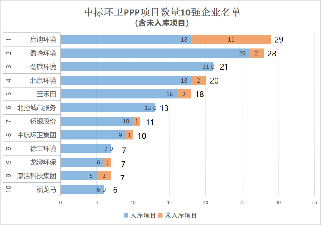 在337個(gè)已開(kāi)標(biāo)環(huán)衛(wèi)PPP項(xiàng)目中,啟迪環(huán)境已中標(biāo)環(huán)衛(wèi)PPP項(xiàng)目數(shù)量多達(dá)29個(gè),排名第一,占全部已已開(kāi)標(biāo)環(huán)衛(wèi)PPP項(xiàng)目總量的8.6%。