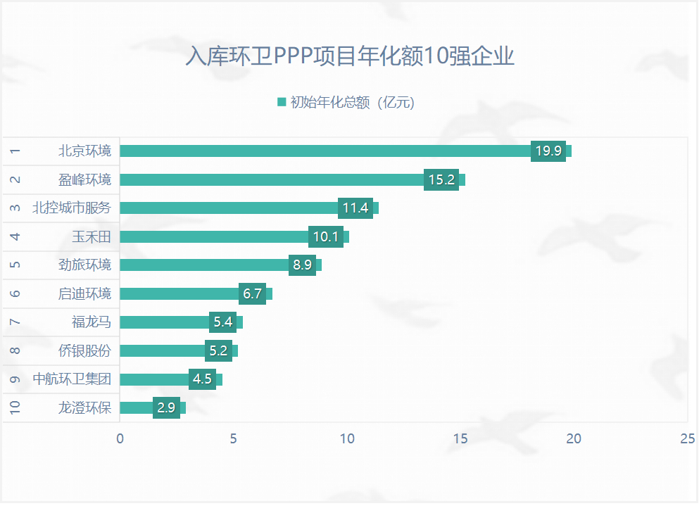 在302個(gè)入庫(kù)且已開(kāi)標(biāo)環(huán)衛(wèi)PPP項(xiàng)目中,北京環(huán)境入庫(kù)項(xiàng)目年化總額接近20億元(按初始年化額計(jì)算),排名第一,占全部已入庫(kù)且已開(kāi)標(biāo)環(huán)衛(wèi)PPP項(xiàng)目年化總額的13%。