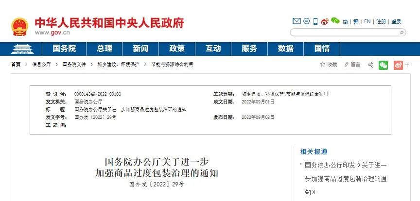國務(wù)院辦公廳關(guān)于進一步加強商品過度包裝治理的通知各省、自治區(qū)、直轄市人民政府,國務(wù)院各部委、各直屬機構(gòu):商品過度包裝是指超出了商品保護、展示、儲存、運輸?shù)日9δ芤蟮陌b,主要表現(xiàn)為包裝層數(shù)過多、包裝空隙過大、包裝成本過高、選材用料不當?shù)?。近年來,各地區(qū)、各部門按照《國務(wù)院辦公廳關(guān)于治理商品過度包裝工作的通知》(國辦發(fā)〔2009〕5號)部署,認真推進商品過度包裝治理,完善相關(guān)法律法規(guī)標準,取得積極進展。但治理工作仍存在不少薄弱環(huán)節(jié)和突出問題,尤其是隨著消費新業(yè)態(tài)快速發(fā)展,商品過度包裝現(xiàn)象有“卷土重來”之勢。為貫徹落實黨中央、國務(wù)院決策部署,進一步加強商品過度包裝治理,經(jīng)國務(wù)院同意,現(xiàn)就有關(guān)事項通知如下。各地區(qū)、各部門要以習(xí)近平新時代中國特色社會主義思想為指導(dǎo),深入貫徹習(xí)近平生態(tài)文明思想,立足新發(fā)展階段,完整、準確、全面貫徹新發(fā)展理念,構(gòu)建新發(fā)展格局,推動高質(zhì)量發(fā)展,認真貫徹落實固體廢物污染環(huán)境防治法、消費者權(quán)益保護法、標準化法、價格法等法律法規(guī)和國家有關(guān)標準,充分認識進一步加強商品過度包裝治理的重要性和緊迫性,在生產(chǎn)、銷售、交付、回收等各環(huán)節(jié)明確工作要求,強化監(jiān)管執(zhí)法,健全標準體系,完善保障措施,堅決遏制商品過度包裝現(xiàn)象,為促進生產(chǎn)生活方式綠色轉(zhuǎn)型、加強生態(tài)文明建設(shè)提供有力支撐。到2025年,基本形成商品過度包裝全鏈條治理體系,相關(guān)法律法規(guī)更加健全,標準體系更加完善,行業(yè)管理水平明顯提升,線上線下一體化執(zhí)法監(jiān)督機制有效運行,商品過度包裝治理能力顯著增強。月餅、粽子、茶葉等重點商品過度包裝違法行為得到有效遏制,人民群眾獲得感和滿意度顯著提升。(一)加強包裝領(lǐng)域技術(shù)創(chuàng)新。推動包裝企業(yè)提供設(shè)計合理、用材節(jié)約、回收便利、經(jīng)濟適用的包裝整體解決方案,自主研發(fā)低克重、高強度、功能化包裝材料及其生產(chǎn)設(shè)備,創(chuàng)新研發(fā)商品和快遞一體化包裝產(chǎn)品。充分發(fā)揮包裝企業(yè)在推廣簡約包裝、倡導(dǎo)理性消費中的橋梁紐帶作用,推動包裝設(shè)計、商品生產(chǎn)等上下游各環(huán)節(jié)踐行簡約適度理念。(工業(yè)和信息化部和各地方人民政府按職責(zé)分工負責(zé))(二)防范商品生產(chǎn)環(huán)節(jié)過度包裝。督促指導(dǎo)商品生產(chǎn)者嚴格按照限制商品過度包裝強制性標準生產(chǎn)商品,細化限制商品過度包裝的管理要求,建立完整的商品包裝信息檔案,記錄商品包裝的設(shè)計、制造、使用等信息。引導(dǎo)商品生產(chǎn)者使用簡約包裝,優(yōu)化商品包裝設(shè)計,減少商品包裝層數(shù)、材料、成本,減少包裝體積、重量,減少油墨印刷,采用單一材料或便于分離的材料。(工業(yè)和信息化部、市場監(jiān)管總局等部門和各地方人民政府按職責(zé)分工負責(zé))督促商品生產(chǎn)者嚴格遵守標準化法要求,公開其執(zhí)行的包裝有關(guān)強制性標準、推薦性標準、團體標準或企業(yè)標準的編號和名稱。(市場監(jiān)管總局和各地方人民政府按職責(zé)分工負責(zé))引導(dǎo)醫(yī)療機構(gòu)針對門診、住院、慢性病等不同場景和類型提出藥品包裝規(guī)格需求。引導(dǎo)藥品生產(chǎn)者優(yōu)化藥品包裝規(guī)格。(國家衛(wèi)生健康委、國家藥監(jiān)局和各地方人民政府按職責(zé)分工負責(zé))(三)避免銷售過度包裝商品。督促指導(dǎo)商品銷售者細化采購、銷售環(huán)節(jié)限制商品過度包裝有關(guān)要求,明確不銷售違反限制商品過度包裝強制性標準的商品。加強對電商企業(yè)的督促指導(dǎo),實現(xiàn)線上線下要求一致。鼓勵商品銷售者向供應(yīng)方提出有關(guān)商品綠色包裝和簡約包裝要求。(商務(wù)部、市場監(jiān)管總局和各地方人民政府按職責(zé)分工負責(zé))督促指導(dǎo)外賣平臺企業(yè)完善平臺規(guī)則,對平臺內(nèi)經(jīng)營者提出外賣包裝減量化要求。(商務(wù)部負責(zé))督促指導(dǎo)餐飲經(jīng)營者對外賣包裝依法明碼標價。(市場監(jiān)管總局和各地方人民政府按職責(zé)分工負責(zé))(四)推進商品交付環(huán)節(jié)包裝減量化。指導(dǎo)寄遞企業(yè)制修訂包裝操作規(guī)范,細化限制快遞過度包裝要求,并通過規(guī)范作業(yè)減少前端收寄環(huán)節(jié)的過度包裝。鼓勵寄遞企業(yè)使用低克重、高強度的紙箱、免膠紙箱,通過優(yōu)化包裝結(jié)構(gòu)減少填充物使用量。(國家郵政局和各地方人民政府按職責(zé)分工負責(zé))推行快遞包裝綠色產(chǎn)品認證,推廣使用綠色快遞包裝。(國家郵政局、市場監(jiān)管總局負責(zé))督促指導(dǎo)電商平臺企業(yè)加強對平臺內(nèi)經(jīng)營者的引導(dǎo),提出快遞包裝減量化要求。(商務(wù)部負責(zé))督促指導(dǎo)電商企業(yè)加強上下游協(xié)同,設(shè)計并應(yīng)用滿足快遞物流配送需求的電商商品包裝,推廣電商快件原裝直發(fā)。(商務(wù)部、國家郵