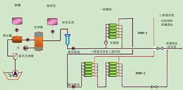 垃圾堆上滲下的滲濾液首先抽到調(diào)節(jié)池,然后從調(diào)節(jié)池抽到藍式過濾器將飛蟲等過濾,之后進入原水罐,原水罐里面自動添加硫酸調(diào)節(jié)酸堿度,此時硫酸和原水反應過程中會生成硫化氫氣體。原水進水泵將調(diào)節(jié)好的原水經(jīng)高壓泵打到膜柱過濾,產(chǎn)生的清水進入清水罐,經(jīng)過大流量濾芯吸附氨氮、硫化物等后,再經(jīng)離交罐(又名樹脂罐)二次吸附氨氮、硫化物,然后排放至清水池,由水處理站排放。同時將吸附過濾后剩下的濃縮液打到濃水罐,用濃水泵抽到垃圾堆上,重新滲下循環(huán)處理。