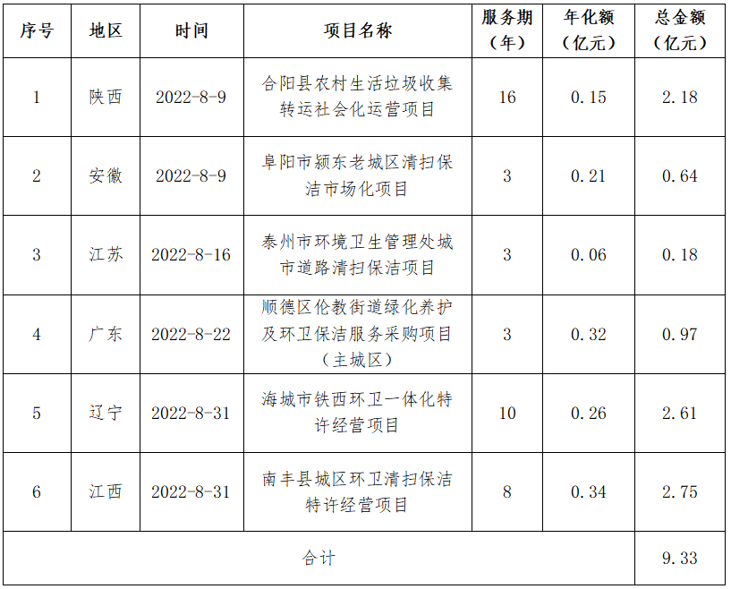 8月,河北昌潤(rùn)達(dá)環(huán)境工程有限公司憑借19.36億元的定州市城區(qū)環(huán)境衛(wèi)生市場(chǎng)化服務(wù)項(xiàng)目登頂企業(yè)月度排行榜榜首。定州市城區(qū)環(huán)境衛(wèi)生市場(chǎng)化服務(wù)項(xiàng)目特許經(jīng)營(yíng)期12年。服務(wù)范圍為河北省定州市市區(qū)西城、北城、南城、長(zhǎng)安辦、經(jīng)濟(jì)開發(fā)區(qū)及高速高鐵站主次干道、小街巷、商業(yè)街區(qū)、便民市場(chǎng)和市區(qū)水域,清掃保潔總面積9617672.66平方米,項(xiàng)目負(fù)責(zé)公共區(qū)域生活垃圾(不含物業(yè)小區(qū)其他垃圾)產(chǎn)生量每天200~260噸。昌潤(rùn)達(dá)以1.61億元/年的投標(biāo)報(bào)價(jià)位中標(biāo)該項(xiàng)目。昌潤(rùn)達(dá)成立于2014年8月,位于保定市國(guó)家大學(xué)科技園8號(hào)樓,是河北省首批成立的一家集垃圾分類、城鄉(xiāng)環(huán)衛(wèi)一體化、公用設(shè)施管理維護(hù)、農(nóng)村廁改與吸污處理、智慧環(huán)衛(wèi)等多位一體的科技型環(huán)衛(wèi)一體化大型集團(tuán),系中國(guó)清潔服務(wù)行業(yè)百?gòu)?qiáng)企業(yè)。昌潤(rùn)達(dá)是一家典型的立足本土的環(huán)衛(wèi)企業(yè),其服務(wù)區(qū)域主要集中在保定市及周邊縣、區(qū)和邯鄲市部分縣鄉(xiāng)村。2021年8月,知名物企佳兆業(yè)美好曾宣布擬以3.67億元的價(jià)格收購(gòu)昌潤(rùn)達(dá)70%的股權(quán),但最終因“公司經(jīng)營(yíng)策略調(diào)整”,交易在年底告吹。從今年中標(biāo)的項(xiàng)目來看,昌潤(rùn)達(dá)似乎還沒有準(zhǔn)備走出河北,依舊在深耕自己的“一畝三分地”。● 北控城市環(huán)境連下五城,全年項(xiàng)目金額超48億元8月,北控城市環(huán)境迎來一波拿標(biāo)高潮,連續(xù)中標(biāo)5個(gè)環(huán)衛(wèi)項(xiàng)目,合計(jì)中標(biāo)金額達(dá)17.57億元,一舉拿下榜眼位置。表2 北控城市環(huán)境8月中標(biāo)項(xiàng)目匯總