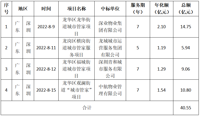 表5 深圳8月開標(biāo)“城市管家”項(xiàng)目匯總