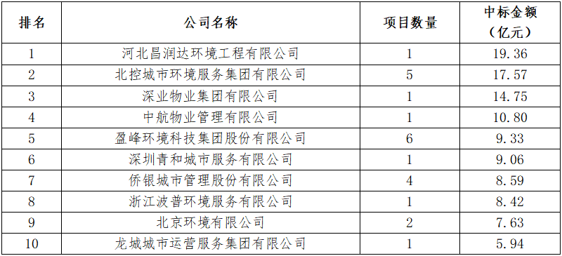 8月,竟有6企業(yè)憑中標(biāo)1項(xiàng)目進(jìn)入前十,其中昌潤(rùn)達(dá)、深業(yè)物業(yè)更是憑1項(xiàng)目而排名前三。8月份企業(yè)排名如表1所示。表1 8月環(huán)衛(wèi)項(xiàng)目中標(biāo)企業(yè)排行榜