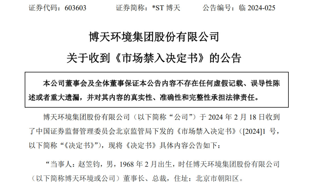 博天環(huán)境受處罰一事又有新進(jìn)展。2月19日,博天環(huán)境公告稱(chēng),公司于2月18日收到北京證監(jiān)局下發(fā)的《市場(chǎng)禁入決定書(shū)》,認(rèn)定博天環(huán)境2017年、2018年、2019年、2020年、2021年年度報(bào)告存在虛假記載,構(gòu)成《證券法》所述的信息披露違法行為。