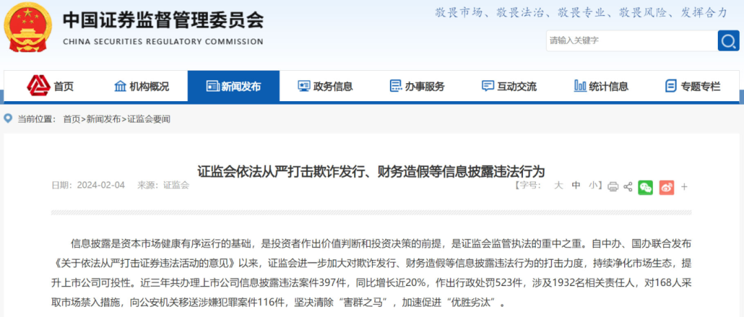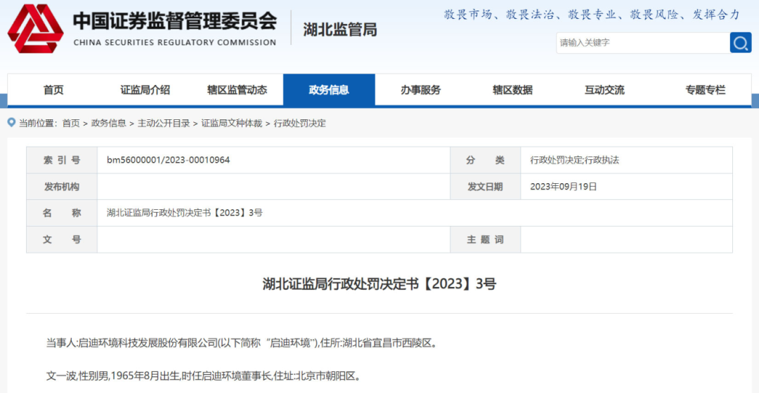 就在上個(gè)月,1月7日晚間,興源環(huán)境公告收到《行政處罰決定書(shū)》,因全資子公司存在虛增項(xiàng)目收入及成本等情況,導(dǎo)致公司財(cái)務(wù)數(shù)據(jù)存在虛假記載,興源環(huán)境及公司財(cái)務(wù)總監(jiān)分別被罰。《行政處罰決定書(shū)》顯示,興源環(huán)境的全資子公司——杭州中藝生態(tài)環(huán)境工程有限公司(下稱(chēng)“中藝生態(tài)”)于2016年、2017年在長(zhǎng)興縣美麗城鎮(zhèn)(標(biāo)段一、標(biāo)段二)PPP項(xiàng)目、溫州洞頭區(qū)本島海洋生態(tài)廊道整治修復(fù)工程PPP項(xiàng)目中存在虛增項(xiàng)目收入及成本等情況,導(dǎo)致興源環(huán)境2016年至2022年年報(bào)財(cái)務(wù)數(shù)據(jù)及相關(guān)披露存在虛假記載。浙江證監(jiān)局決定,對(duì)興源環(huán)境責(zé)令改正,給予警告,并處以200萬(wàn)元罰款;對(duì)公司財(cái)務(wù)總監(jiān)孫穎給予警告,并處以80萬(wàn)元罰款。事實(shí)上,興源環(huán)境接受處罰多少有點(diǎn)“冤枉”,因?yàn)?span style="margin: 0px; padding: 0px; outline: 0px; max-width: 100%; box-sizing: border-box !important; overflow-wrap: break-word !important;">此次導(dǎo)致處罰的中藝生態(tài)是興源環(huán)境收購(gòu)而來(lái)的,2016年才納入合并報(bào)表,當(dāng)時(shí)雙方還簽署了業(yè)績(jī)承諾補(bǔ)償協(xié)議。這次虛增項(xiàng)目收入的事件爆發(fā)后,興源環(huán)境也表示,將高度重視業(yè)績(jī)承諾補(bǔ)償?shù)淖酚懝ぷ?,擬安排專(zhuān)門(mén)隊(duì)伍并聘請(qǐng)專(zhuān)業(yè)機(jī)構(gòu)進(jìn)行研判,切實(shí)推動(dòng)相關(guān)工作有效開(kāi)展。還有此前曾被媒體曝出過(guò)“財(cái)務(wù)造假”的啟迪環(huán)境。2023年9月,湖北證監(jiān)局官網(wǎng)披露,因信息披露違法,對(duì)啟迪環(huán)境給予警告并處罰款60萬(wàn)元,對(duì)時(shí)任董事長(zhǎng)文一波等4位相關(guān)責(zé)任人給予警告并處罰款30萬(wàn)元。▼圖片來(lái)源:中國(guó)證券監(jiān)督管理委員會(huì)調(diào)查顯示,啟迪環(huán)境在2017年-2018年間,通過(guò)偽造虛假分包合同及節(jié)點(diǎn)結(jié)算單確認(rèn)成本,虛構(gòu)了相關(guān)PPP項(xiàng)目(向社會(huì)資本開(kāi)放的基礎(chǔ)設(shè)施建設(shè)和公共服務(wù)項(xiàng)目)合同完工百分比,提前確認(rèn)或虛假確認(rèn)總包合同收入,導(dǎo)致啟迪環(huán)境2017、2018年年報(bào)中主營(yíng)業(yè)務(wù)收入、主營(yíng)業(yè)務(wù)成本等項(xiàng)目存在虛假記載。2023年7月,龍凈環(huán)保收到中國(guó)證監(jiān)會(huì)福建監(jiān)管局的行政處罰決定書(shū),認(rèn)定ST龍凈未按規(guī)定披露關(guān)聯(lián)交易,決定對(duì)公司給予警告,并處以一百萬(wàn)元罰款。還有幾位相關(guān)責(zé)任人分別給予了警告和數(shù)額不等的罰款。再往前一個(gè)月,2023年6月,美尚生態(tài)也曾收到中國(guó)證監(jiān)會(huì)的行政處罰決定書(shū),認(rèn)定美尚生態(tài)2015年公司招股說(shuō)明書(shū)、2015年至2019年年報(bào)、2020年半年報(bào)、2016年非公開(kāi)發(fā)行股份及支付現(xiàn)金購(gòu)買(mǎi)資產(chǎn)并募集配套資金暨關(guān)聯(lián)交易報(bào)告書(shū)、2017年面向合格投資者公開(kāi)發(fā)行公司債券募集說(shuō)明書(shū)等信息披露文件存在虛假記載,決定對(duì)其責(zé)令改正,給予警告,并處以1330萬(wàn)元罰款。更早以前,卓錦股份于2023年5月,*ST科林于2023年2月,也曾分別收到過(guò)證監(jiān)部門(mén)的處罰決定書(shū),責(zé)令改正,給予警告,并處以一定數(shù)額的罰款。*ST科林的兩位相關(guān)當(dāng)事人杜簡(jiǎn)丞、李根旺還被分別采取了3年證券市場(chǎng)禁入措施。證監(jiān)會(huì)嚴(yán)打財(cái)務(wù)造假