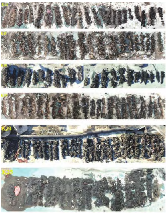 為制定陳腐垃圾綜合利用方案,2021 年對填埋場進行場地調(diào)查。在填埋堆體上布設了 6 個采樣點位(K11、K15、K18、K19、K24、K25),根據(jù)采樣孔垃圾分層情況,每層采集 3 個樣品制成 1 個混合樣,保證每個點位 3 個混合樣,垃圾樣品按 10% 的比例采集現(xiàn)場平行樣,共采集垃圾混合樣品 18 個。帶回實驗室后,每個點位的垃圾樣品制成 1 個最終混合樣。垃圾物理指標:容重、含水率、物理組成,垃圾樣品化學檢測檢測指標:pH值、有機質(zhì)、TN、TP、總鉀、重金屬(Cu、Zn、Pb、Hg、Cr、As、Cd)。
