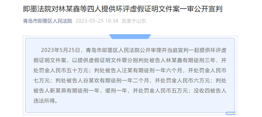“十四五”以來,生態(tài)環(huán)境部會(huì)同最高法、最高檢、公安部、市場(chǎng)監(jiān)管總局一起,連續(xù)四年針對(duì)第三方環(huán)保服務(wù)機(jī)構(gòu)造假的問題開展了專項(xiàng)整治。同時(shí),環(huán)境部還采用“四不兩直”檢查、監(jiān)督幫扶、大數(shù)據(jù)監(jiān)管,乃至中央生態(tài)環(huán)境保護(hù)督察等有效手段來打擊第三方環(huán)保服務(wù)機(jī)構(gòu)造假行為,取得了很好的效果。這三年,環(huán)境部查處了2260家有違法行為的第三方環(huán)保服務(wù)機(jī)構(gòu),向有關(guān)部門移送了193起案件進(jìn)行刑事立案,還公開曝光了457個(gè)典型案例。另外,他們還查處了企業(yè)在環(huán)境自行監(jiān)測(cè)方面的造假案件4255件,向有關(guān)部門移送了930起涉嫌違法犯罪的案件。這些案件當(dāng)中,包括去年在社會(huì)上影響比較大的山東錦華公司的環(huán)評(píng)造假案、江西展航公司的環(huán)評(píng)造假案、廣東廣禾公司的機(jī)動(dòng)車檢測(cè)造假案等,這些案件都已經(jīng)宣判,并且產(chǎn)生了很好的社會(huì)效果,起到了震懾和警示作用。第二,推動(dòng)了行刑銜接,提升了監(jiān)管執(zhí)法效能。環(huán)境部和最高檢、公安部一起構(gòu)建了行刑銜接、一體化推進(jìn)的聯(lián)動(dòng)執(zhí)法機(jī)制,形成了共同會(huì)商、共同掛牌督辦、共同公布典型案件以及共同部署相關(guān)工作的“組合拳”,有效地提升了我們的監(jiān)管執(zhí)法效能。以前面提到過的“山東錦華公司造假案”為例,環(huán)評(píng)公司利用掛靠、偽造他人簽名的方式充當(dāng)虛假環(huán)評(píng)文件的制造者,這些年偽造虛假的環(huán)境影響報(bào)告書48份、環(huán)境影響報(bào)告表879份,數(shù)目巨大、性質(zhì)惡劣。▼“山東錦華環(huán)評(píng)造假案”宣判。圖片來源:青島市即墨區(qū)人民法院