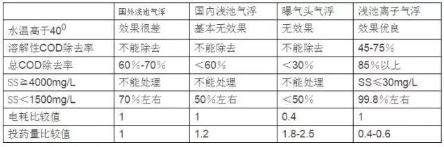 由表1可見,各項(xiàng)數(shù)據(jù)表明淺池氣浮處理效果優(yōu)于曝氣氣浮,在淺池氣浮中離子氣浮的COD、SS處理技術(shù)指標(biāo)及使用效果更佳。