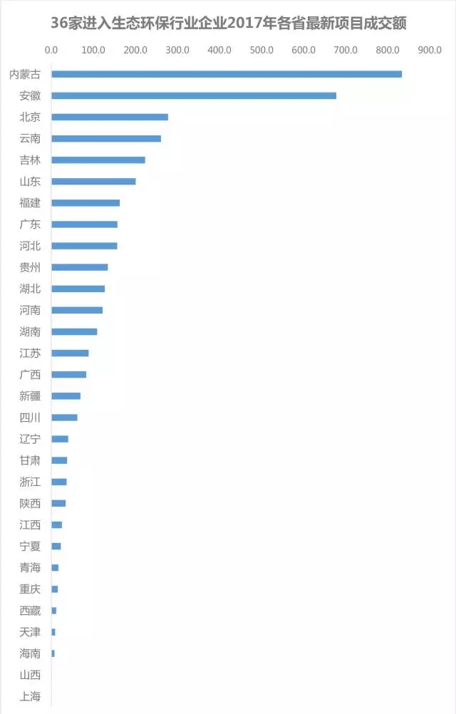 截至2017年10月31日, 36家企業(yè)在生態(tài)環(huán)保領(lǐng)域總中標(biāo)金額達(dá)到4010.3億元,項(xiàng)目數(shù)量達(dá)268個(gè)。國(guó)企中生態(tài)環(huán)保領(lǐng)域業(yè)績(jī)最好的是北控水務(wù),總投資額達(dá)882億元,民企中業(yè)績(jī)最好的是東方園林,總投資額達(dá)444.5億元。