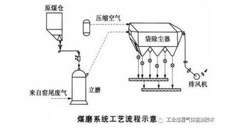 煤磨利用窯尾煙氣作為烘干介質(zhì),立磨入口溫度一般在150℃左右,出口煙氣溫度高于露點溫度15~30℃,一般控制在75℃左右。煤磨出口煙氣溫度均在著火或自燃溫度范圍外(煤粉的著火溫度:500~530℃,自燃溫度:140~350℃)。
