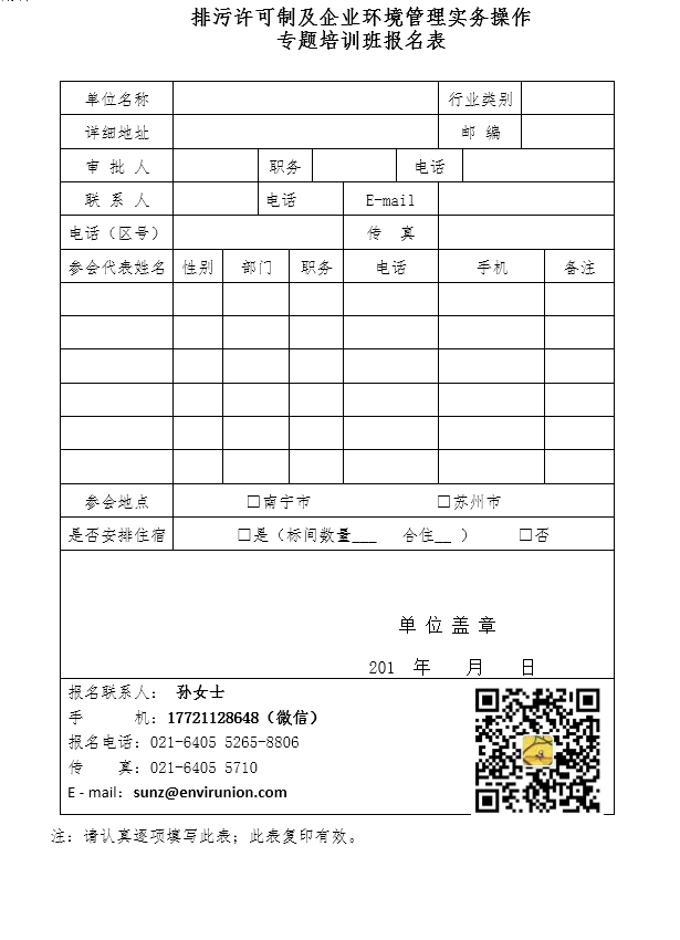 附件:關(guān)于舉辦排污許可制及企業(yè)環(huán)境管理實(shí)務(wù)操作專題培訓(xùn)班報(bào)名表
