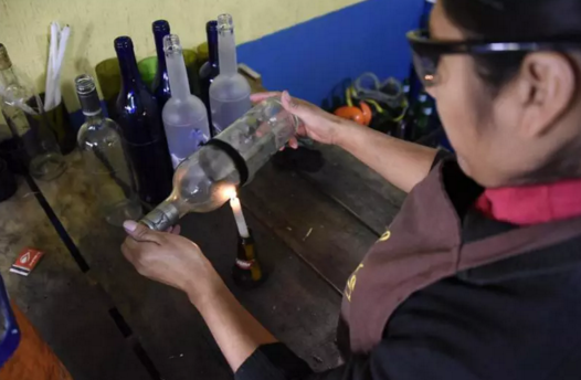 在危地馬拉首都危地馬拉城的一個(gè)工廠,一名婦女把回收的廢玻璃瓶重新制成可以在超市出售的玻璃杯和花瓶等,實(shí)現(xiàn)廢物利用