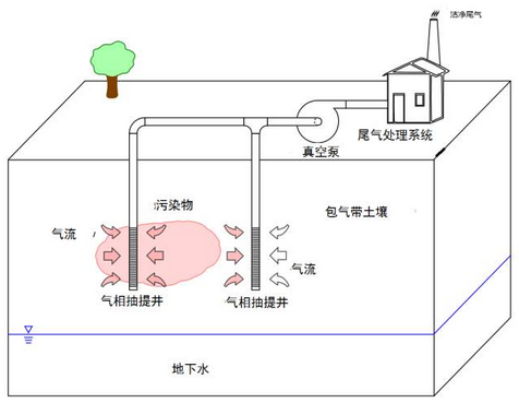 (2) 真空泵抽氣促使土壤氣流動,污染物從隨氣相抽出。