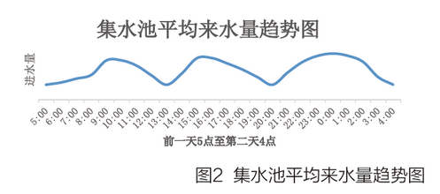二十四小時平均進水量趨勢圖如圖2所示,從圖可以看出,在早上7點左右進水量逐漸增大,當?shù)竭_十一點左右到達第一次峰值。這是由于人們早上用水量增大,通常情況下早上七點左右為用水高峰,而通過管網(wǎng)的延時,導致進水量在十點左右到達高峰。同樣的十三點和第二天零點分別是兩次進水高峰。第三次高峰段的延長是由于這段時間人們生活所致,例如晚飯時間用水及洗澡時間的用水等造成水量的持續(xù)高峰。