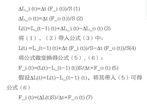 我們假設(shè)t時刻來水流量為Fi(t),集水池的液位就為L(t),S為集水池的底面積,膜進水量Fo(t),ΔL_i(t)為來水液位增量,L_(t-1)(t)為t-1時的液位,ΔL_o(t)為超濾系統(tǒng)處理產(chǎn)量對業(yè)務(wù)液位增量??傻弥?/p>