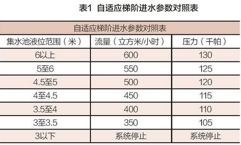 表1是本系統(tǒng)中梯階自適應(yīng)液位與流量壓力的參數(shù)對照表。這里的壓力與流量是對應(yīng)的,其壓力是根據(jù)膜的參數(shù)信息進行對照查詢所得。液位與流量則是通過粗略計算和實驗矯正所得。當集水池液位大于6米時,存在溢出風險,這個時候系統(tǒng)滿負荷運行。當?shù)陀?米時,為了防止提升泵干抽,我們將停止系統(tǒng)運轉(zhuǎn)。
