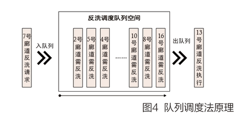 這里我們采用隊列法來處理廊道競爭問題。隊列法是一種遵循先進先出原則的調(diào)度方法。具體原理如圖4所示。隊列調(diào)度由入隊列、出隊列和調(diào)度隊列空間三部分組成。入隊列是根據(jù)廊道反洗請求情況將有反洗需求的廊道壓入到隊列空間的過程。出隊列則是根據(jù)當前的反洗設(shè)備的運行狀況將需要反洗的廊道彈出隊列的過程。反洗調(diào)度隊列空間即扮演一個存儲調(diào)度序列的角色,同時其還具有優(yōu)化和排布序列的功能。