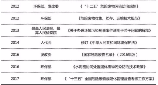 危廢政策不斷出臺(tái),尤其是省級(jí)細(xì)則落地:1)2017年環(huán)保部出臺(tái)“十三五”全國(guó)危險(xiǎn)廢物規(guī)范化管理督查考核工作方案,各省近期均推出省級(jí)危廢規(guī)范化管理督查方案;2)《國(guó)家危險(xiǎn)廢物名錄》自2016年8月1日起施行;新修訂的《固體廢物污染環(huán)境防治法》取消危險(xiǎn)廢物省內(nèi)轉(zhuǎn)移審批手續(xù);3)2016年最高司法機(jī)關(guān)就環(huán)境污染犯罪出臺(tái)專門司法解釋;4)2018年起實(shí)施《環(huán)境保護(hù)稅法》,危廢稅額1000元/噸;5)環(huán)保部發(fā)布《水泥窯協(xié)同處置固體廢物污染防治技術(shù)政策》,支持水泥窯協(xié)同處置。