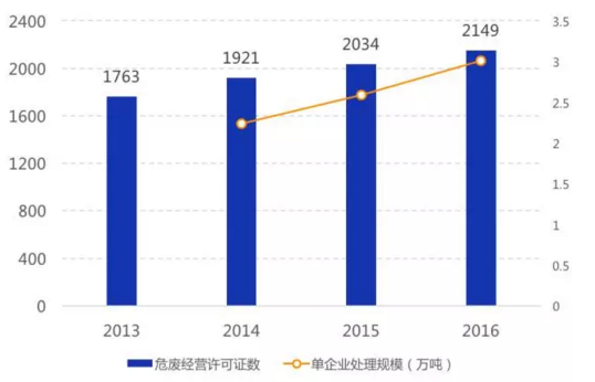 資質(zhì)企業(yè)平均規(guī)模較?。?016年我國(guó)持危險(xiǎn)廢棄物經(jīng)營(yíng)許可證的企業(yè)數(shù)量為2149家,2016年凈增加僅115家,體現(xiàn)出環(huán)保系統(tǒng)對(duì)新頒發(fā)許可證愈發(fā)謹(jǐn)慎;平均每家處理量?jī)H不到3萬(wàn)噸,呈現(xiàn)較強(qiáng)的分散性特征,但單企業(yè)處理規(guī)模由2014年2.2萬(wàn)噸/年增加到2016年3.0萬(wàn)噸/年,未來(lái)隨著許可證頒發(fā)與復(fù)核難度加大,實(shí)力弱、技術(shù)差的小企業(yè)將被淘汰出市場(chǎng),龍頭擴(kuò)張,單企業(yè)規(guī)模繼續(xù)擴(kuò)大。