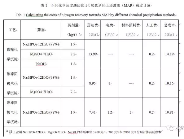 采用鳥糞石結(jié)晶方式回收氮受環(huán)境影響因素較大,pH、NH4+濃度、溫度以及陽(yáng)離子競(jìng)爭(zhēng)(如Ca2+與Mg2+競(jìng)爭(zhēng))等。我們前期研究表明,獲得較純鳥糞石的pH并非大多文獻(xiàn)述及的堿性條件,而是中性、甚至偏酸性(pH£7.5)環(huán)境[20]。中性以下的pH固然可以獲得較為純凈的鳥糞石,但所需反應(yīng)時(shí)間甚長(zhǎng),需要以催化方式(如,電化學(xué)沉積法[20])加速反應(yīng),這勢(shì)必增加回收技術(shù)的復(fù)雜程度。事實(shí)上,鳥糞石回收主要針對(duì)磷的回收,氮只不過是順帶“夾裹”而已。即使是針對(duì)鳥糞石回收磷,如果采用電化學(xué)沉積這樣的結(jié)晶法,其生產(chǎn)成本也是極高的。以回收鳥糞石為目的,處理并100%回收1 t NH4+濃度為106.1 mg N/L、PO43-濃度為37. 2 mg P/L厭氧消化上清液,不同工藝反應(yīng)、回收成本計(jì)算見表1;折算后直接化學(xué)沉淀法成本約為163元/kg N,碳棒陽(yáng)極電化學(xué)沉淀為117元/kg N,鎂棒陽(yáng)極電化學(xué)沉淀為124元/kg N。