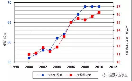 圖6.德國(guó)焚燒廠數(shù)量及焚燒處理量隨時(shí)間的變化