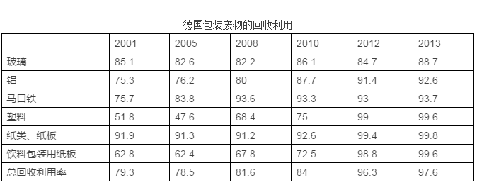 在德國(guó),最常見的包裝材料有玻璃、鋁、馬口鐵、塑料、紙、紙板、木材,全部都能夠被用作二次原料,從而減少對(duì)原生原料的需求,可以起到降低能源消耗及污染排放的作用。根據(jù)《包裝條例》的規(guī)定,居民應(yīng)當(dāng)對(duì)包裝廢物進(jìn)行分類投放。條例獲得了廣泛的公眾支持,2013年時(shí)德國(guó)包裝廢物的回收利用率達(dá)到了97%。