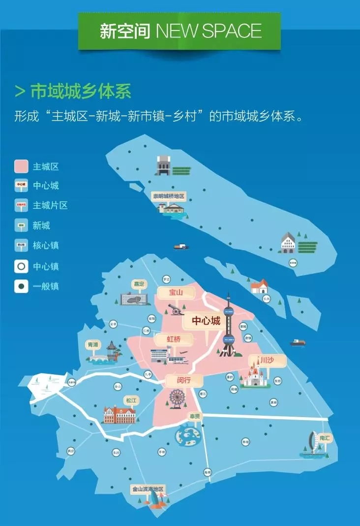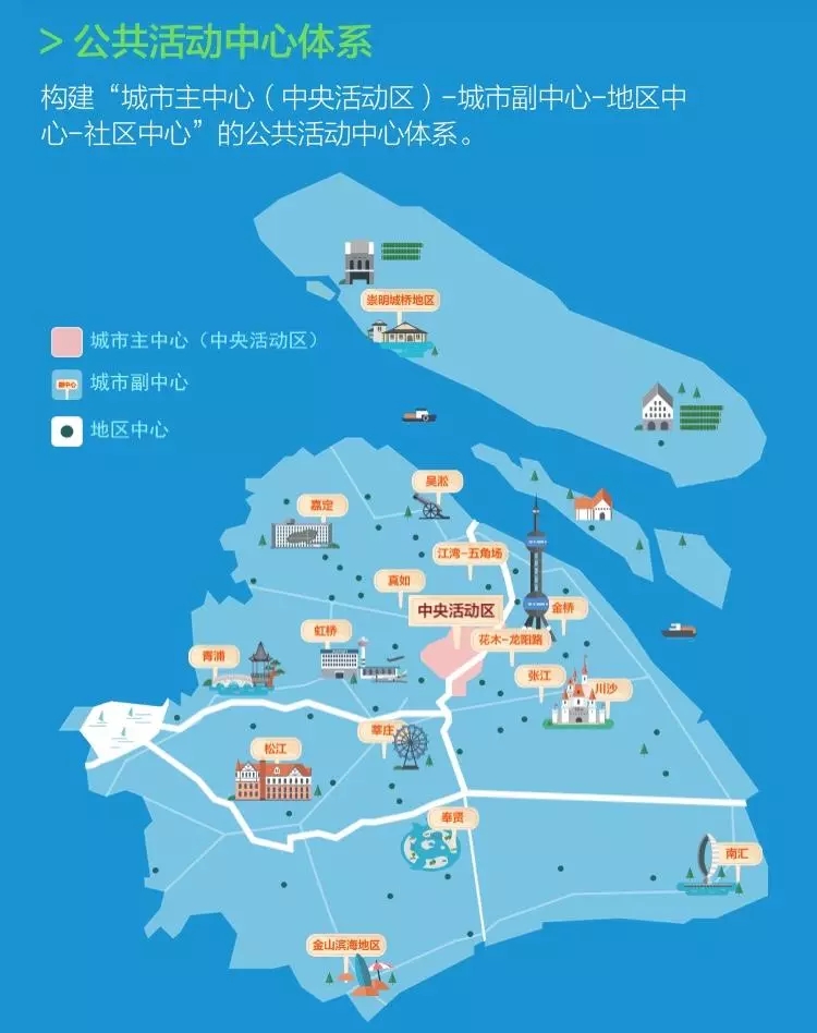 中央活動區(qū)包括小陸家嘴、外灘、人民廣場、徐家匯等十幾個區(qū)域,重點發(fā)展金融服務(wù)、總部經(jīng)濟、商務(wù)辦公、文化娛樂、創(chuàng)新創(chuàng)意、旅游觀光等全球城市核心功能。城市副中心包括五角場等9個主城副中心、5個新城中心和金山濱海地區(qū)、崇明城橋地區(qū)2個核心鎮(zhèn)中心等,發(fā)展面向長三角和市域的綜合服務(wù)中心,兼顧全球城市部分核心功能。地區(qū)中心和社區(qū)中心主要承擔(dān)所在區(qū)域的公共服務(wù)。