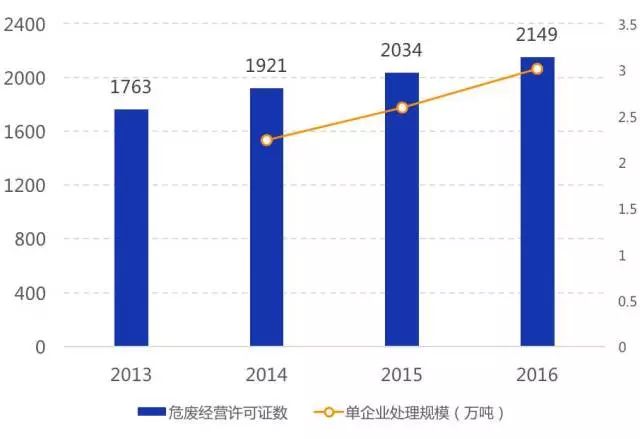 資質(zhì)企業(yè)平均規(guī)模較小:2016年我國持危險(xiǎn)廢棄物經(jīng)營許可證的企業(yè)數(shù)量為2149家,2016年凈增加僅115家,體現(xiàn)出環(huán)保系統(tǒng)對(duì)新頒發(fā)許可證愈發(fā)謹(jǐn)慎;平均每家處理量僅不到3萬噸,呈現(xiàn)較強(qiáng)的分散性特征,但單企業(yè)處理規(guī)模由2014年2.2萬噸/年增加到2016年3.0萬噸/年,未來隨著許可證頒發(fā)與復(fù)核難度加大,實(shí)力弱、技術(shù)差的小企業(yè)將被淘汰出市場,龍頭擴(kuò)張,單企業(yè)規(guī)模繼續(xù)擴(kuò)大。
