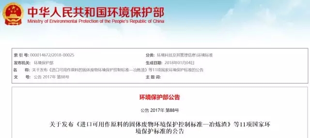 近日,環(huán)境保護(hù)部會(huì)同國(guó)家質(zhì)量監(jiān)督檢驗(yàn)檢疫總局聯(lián)合發(fā)布了《進(jìn)口可用作原料的固體廢物環(huán)境保護(hù)控制標(biāo)準(zhǔn)—冶煉渣》等11項(xiàng)國(guó)家環(huán)境保護(hù)標(biāo)準(zhǔn)。新標(biāo)準(zhǔn)自2018年3月1日起正式實(shí)施。