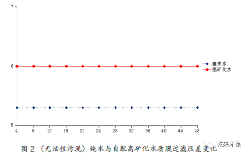 3.1 無活性污泥條件下自配高礦化水對膜污染影響:通過對兩種水質(zhì)跨膜壓差的測定,研究高礦化水質(zhì)對膜通量的影響以及膜兩側(cè)離子濃度的變化。試驗(yàn)過程中采用同一膜,反應(yīng)器中不加入活性污泥,產(chǎn)水通量均設(shè)置為17 L/m2.h、試驗(yàn)溫度相同均為14℃,全過程不進(jìn)行曝氣和反沖,經(jīng)過48 小時的抽吸水,每隔4 小時分別測定膜過濾壓差。(1)跨膜壓差隨時間的變化研究。在相同試驗(yàn)條件下,測得自來水和自配高礦化水兩種水質(zhì)48 小時內(nèi)膜過濾壓差都沒有變化,跨膜壓差分別為5.3 kpa、6.0 kpa,可見,自配高礦化水中無機(jī)鹽離子對膜污染有一定的貢獻(xiàn)。如圖2 所示。