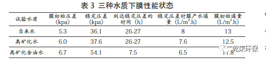 3.2 長慶油田高礦化含油廢水對膜污染影響研究:反應(yīng)器中加入活性污泥,并同時進(jìn)行曝氣,分別以自來水、自配高礦化水、高礦化含油水(即高礦化/ 懸浮物水質(zhì))考察跨膜壓差及膜產(chǎn)水通量隨時間的變化。試驗(yàn)過程中使用同一個膜,污泥濃度為6 g/L,曝氣量為0.35 m3/h,水溫為14℃。測定自來水、自配高礦化水和高礦化含油水初始跨膜壓差、穩(wěn)定跨膜壓差、膜初始通量、穩(wěn)定膜產(chǎn)水通量見表3。