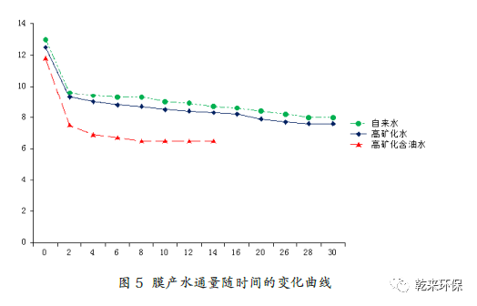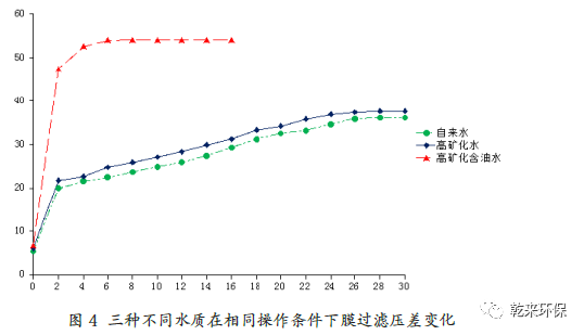 從表3 中可以看出,在蠕動泵同樣抽吸的情況下,自來水、自配高礦化水和高礦化含油水三種水質(zhì)條件下,膜穩(wěn)定壓差依次增大,到達(dá)穩(wěn)定壓差時膜的產(chǎn)水通量依次減小,表明無機(jī)鹽類離子、油類物質(zhì)、機(jī)雜等均造成膜的孔徑堵塞,對膜產(chǎn)生污染影響。