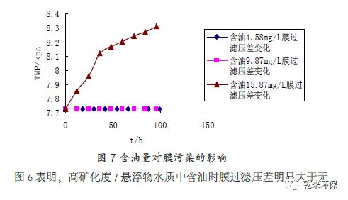 3.3 高礦化度/ 懸浮物水質(zhì)中含油與無油情況下膜過濾壓差的變化:圖6 表明,高礦化度/ 懸浮物水質(zhì)中含油時膜過濾壓差明顯大于無油的膜過濾壓差,并且壓差增長數(shù)值逐漸增大,最大達(dá)到穩(wěn)定。說明含油時水質(zhì)對膜污染影響較大。