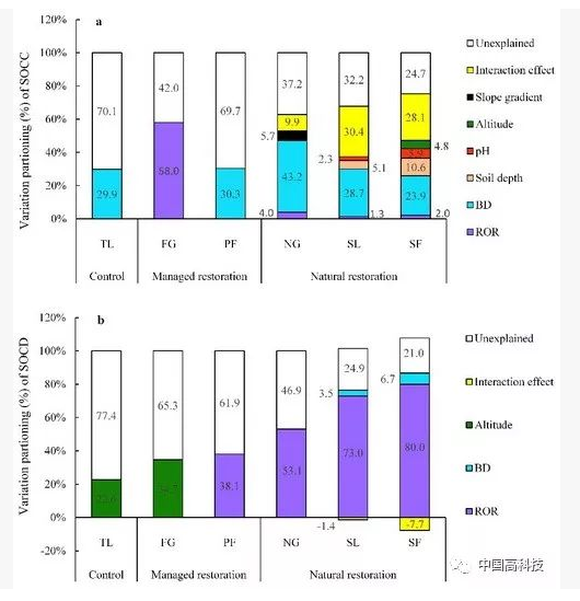 針對這一科學(xué)問題,在王克林和張偉指導(dǎo)下,研究組以耕地為對照,通過分析人工恢復(fù)方式(人工牧草、人工經(jīng)濟林)和自然恢復(fù)方式(撂荒草地、灌木林、次生林)下土壤有機碳變化特征并記錄相應(yīng)的環(huán)境因子信息,解析了不同恢復(fù)模式(人工恢復(fù)和自然恢復(fù))土壤有機碳積累變化規(guī)律,并揭示了其相應(yīng)的環(huán)境驅(qū)動因子。研究發(fā)現(xiàn),自然恢復(fù)模式土壤有機碳含量顯著高于人工恢復(fù)模式和耕地,而短期內(nèi)(9年)人工恢復(fù)模式和耕地之間有機碳含量無顯著差異。不考慮基巖出露對土壤有機碳儲量影響,各植被類型之間有機碳儲量無顯著差異,剔除基巖出露影響后,自然恢復(fù)植被下有機碳儲量顯著高于人工恢復(fù)植被和耕地。方差分解表明,人工恢復(fù)方式下土壤有機碳含量和儲量僅部分變異受環(huán)境因子(如基巖出露率、土壤容重、海拔)影響;而在自然恢復(fù)方式下,環(huán)境因子能有效解釋有機碳含量和儲量的大部分變異,且隨著植被正向演替解釋量逐漸增加,但有機碳含量和儲量的環(huán)境驅(qū)動因子并不相同,前者受多個環(huán)境因子共同驅(qū)動(如土壤容重、基巖出露率、土層深度、pH等),后者則主要受基巖出露率驅(qū)動。基于對不同恢復(fù)模式下有機碳含量和儲量變化分析及其環(huán)境驅(qū)動因子評估結(jié)果表明,相比人工恢復(fù)模式,短期內(nèi)自然恢復(fù)更有利于土壤碳固持,且上述環(huán)境因子可作為評估自然恢復(fù)模式下土壤碳庫變化的重要指標(biāo)。